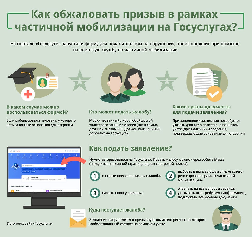 На портале «Госуслуги» заработала форма для подачи жалобы на нарушения, которые произошли при призыве по частичной мобилизации. Заявление поступает в призывную комиссию региона, в котором мобилизованный состоит на воинском учете.